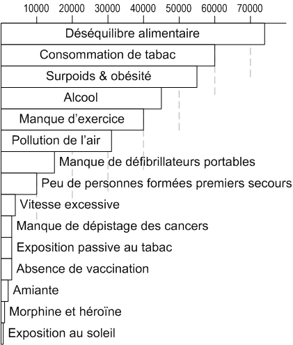 La moitié des décès pourraient être évitésLa moitié des décès en France sont évitables. C'est le constat tiré par le ministère de la santé. Ces décès pourraient être évités par une meilleure hygiène de vie (alimentation, exercice physique, non consommation de tabac ou d'alcool en excès…), par la prévention des accidents et par un meilleur réseau de personnes formées aux premiers secours. Ce constat montre l'étendue des progrès possibles en matière de santé sans faire appel à la médecine curative. Egalement remarquable : l'essentiel de ces décès pourraient être évités pour un coût très faible, et dépendent essentiellement de la prise de conscience de chacun. Mais de quels décès s'agit-il ? La table qui suit recense et quantifie pour la France les causes de décès sur lesquelles nous pouvons agir individuellement. Sa construction est délicate, car de nombreuses maladies et accidents sont « multifactoriels », c'est-à-dire que plusieurs facteurs en favorisent l'apparition, sans pourtant pouvoir être considérés isolement comme responsables. Cette table se restreint donc à des facteurs reconnus comme étant liés à l'apparition de la maladie ou de l'accident par un lien de cause à effet, et sans lesquels le décès n'aurait pas eu lieu. En procédant de cette façon, il arrive que deux facteurs soient identifiés pour un même décès, ce qui indique que la prévention de ce décès aurait été possible de deux façons différentes. C'est par exemple le cas pour un accident de voiture dû à une vitesse trop élevée et à une consommation d'alcool. Tout d'abord, voici un résumé visuel de cette table. La margeur des barres est proportionnelle au nombre de décès évitables en fonction de chaque moyen de prévention identifié.