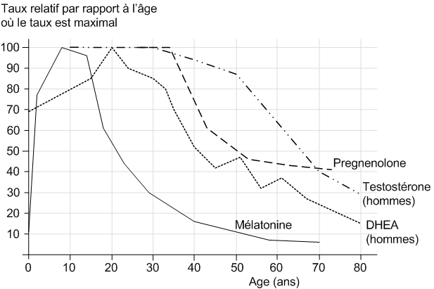 Les hormones servent essentiellement à coordonner le fonctionnement de nos organes. Secrétées par diverses glandes (thymus, glande pinéale…), elles sont indispensables à un bon fonctionnement de notre organisme, et leur concentration est également importante. Le taux de certaines hormones diminue avec l'âge. Le thymus, qui produit une partie de nos hormones, disparaît également vers 40 ans. On considère que cette diminution est un marqueur du vieillissement, c'est-à-dire que la mesure des taux d'hormones dans l'organisme est considérée comme un moyen fiable d'évaluer notre age biologique, indépendamment du nombre de nos années. Le graphique suivant montre le décroissement moyen observé par certaines publications du taux d'hormones avec l'âge. Ce décroissement est inégal selon les personnes, et il s'agit donc bien d'une moyenne.