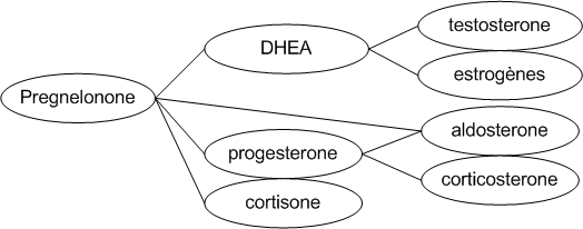 La pregnénolone : l'hormone de la mémoireLa pregnénolone est une hormone dont dérivent ensuite d'autres hormones dites stéroïdes, comme le montre le schéma ci-dessous. La pregnénolone est un précurseur de la DHEA, de la progesterone, de l'aldosterone et de la cortisone. De son côté, la DHEA est un précurseur de la testosterone et des estrogènes.